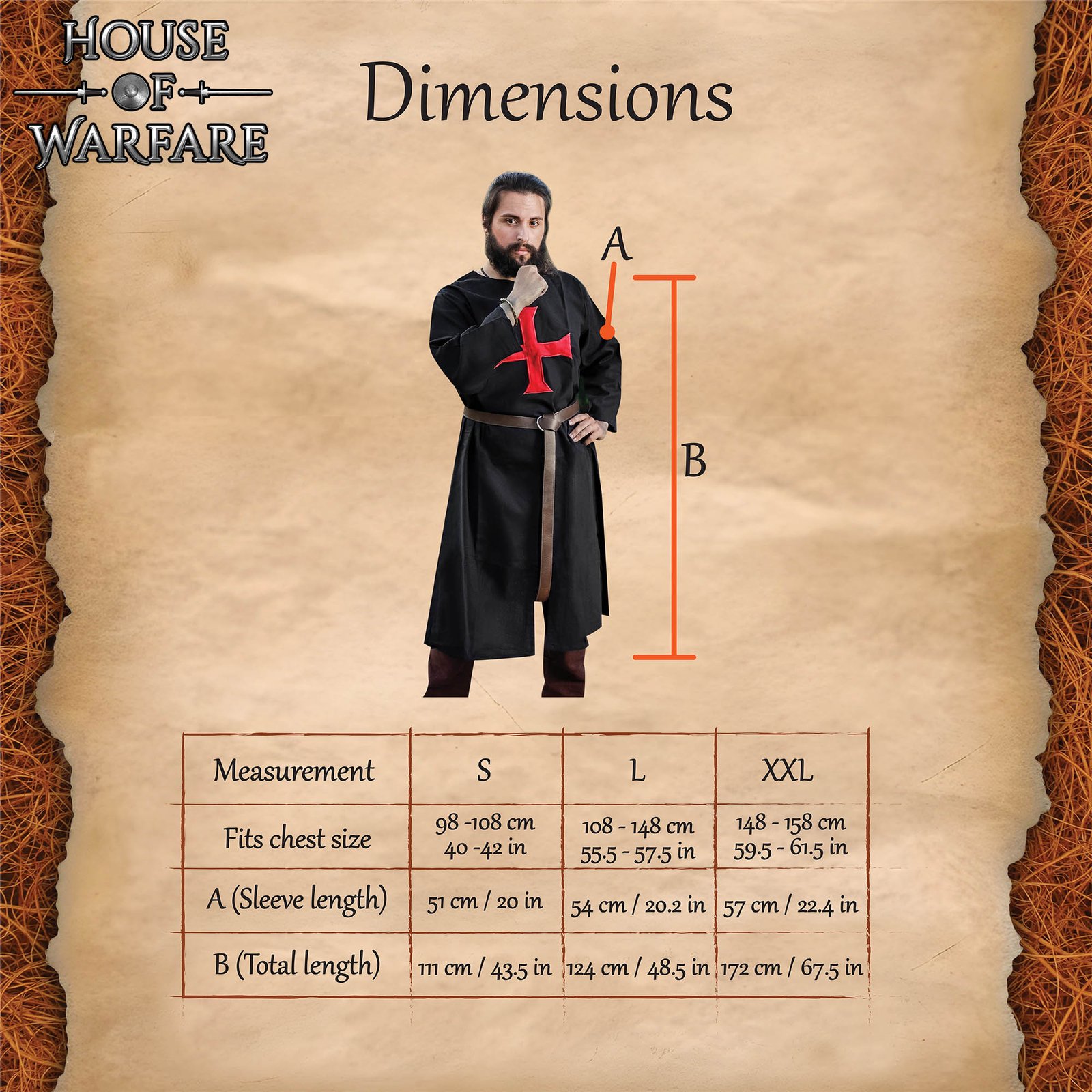 Made from breathable 100% cotton, it is lightweight and comfortable enough for long days at fairs, training, or roleplay battles. The front and side slits give excellent freedom of movement—whether walking through a market, riding on horseback, or sparring in the field. The appliquéd red cross is bold and unmistakable, a powerful visual centerpiece for any Templar or Crusader-inspired kit.