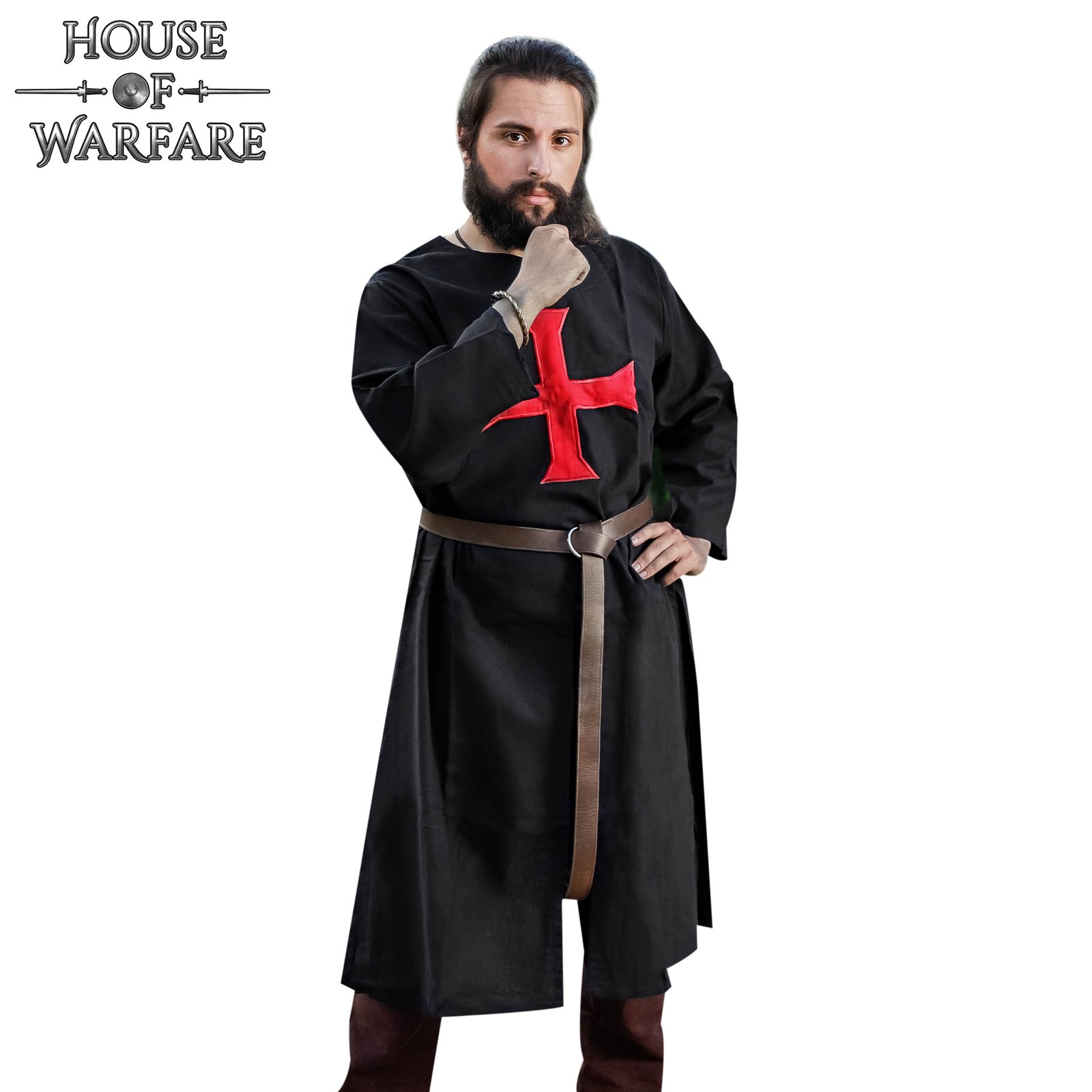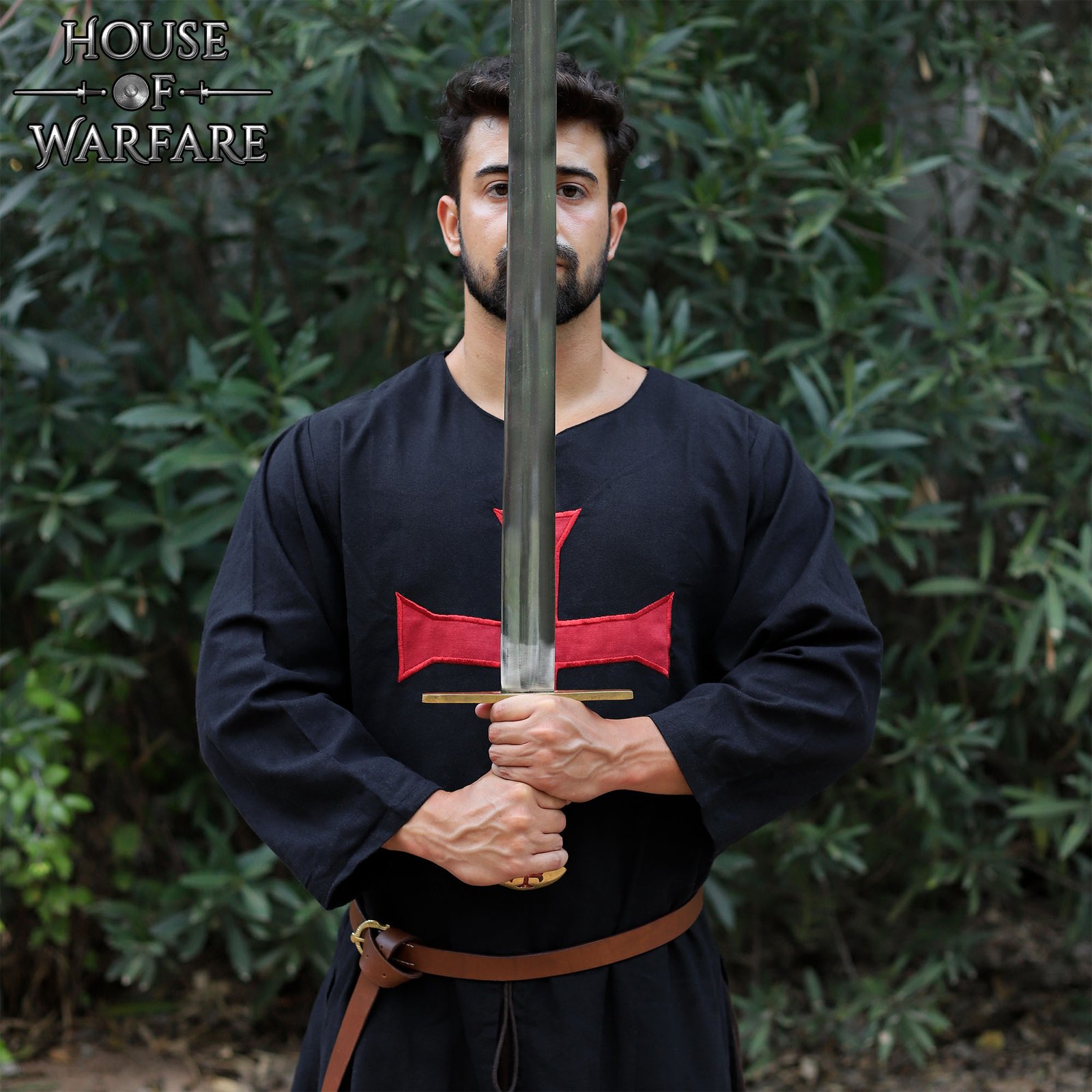March into your next LARP or medieval gathering as a sworn knight of the Temple with this Templar Crusader Tunic, styled after garments worn during the Crusades. Worn over chainmail and gambesons, the black tunic with its striking red cross instantly marks you as a brother of the Order—dedicated to faith, discipline, and the defense of Christendom.