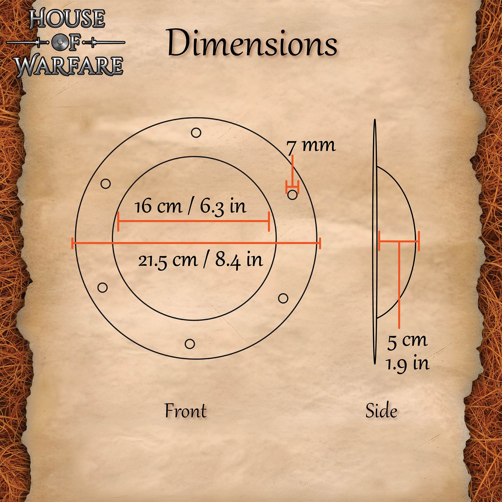 The deeply domed center gives ample room for hand clearance in combat, while the textured, weathered finish makes your shield look like it has already seen countless campaigns. Pre-drilled with six mounting holes and supplied with rivets, it’s battle-ready for quick assembly—whether you’re finishing a Viking round shield, reinforcing a medieval buckler, or upgrading your current kit.