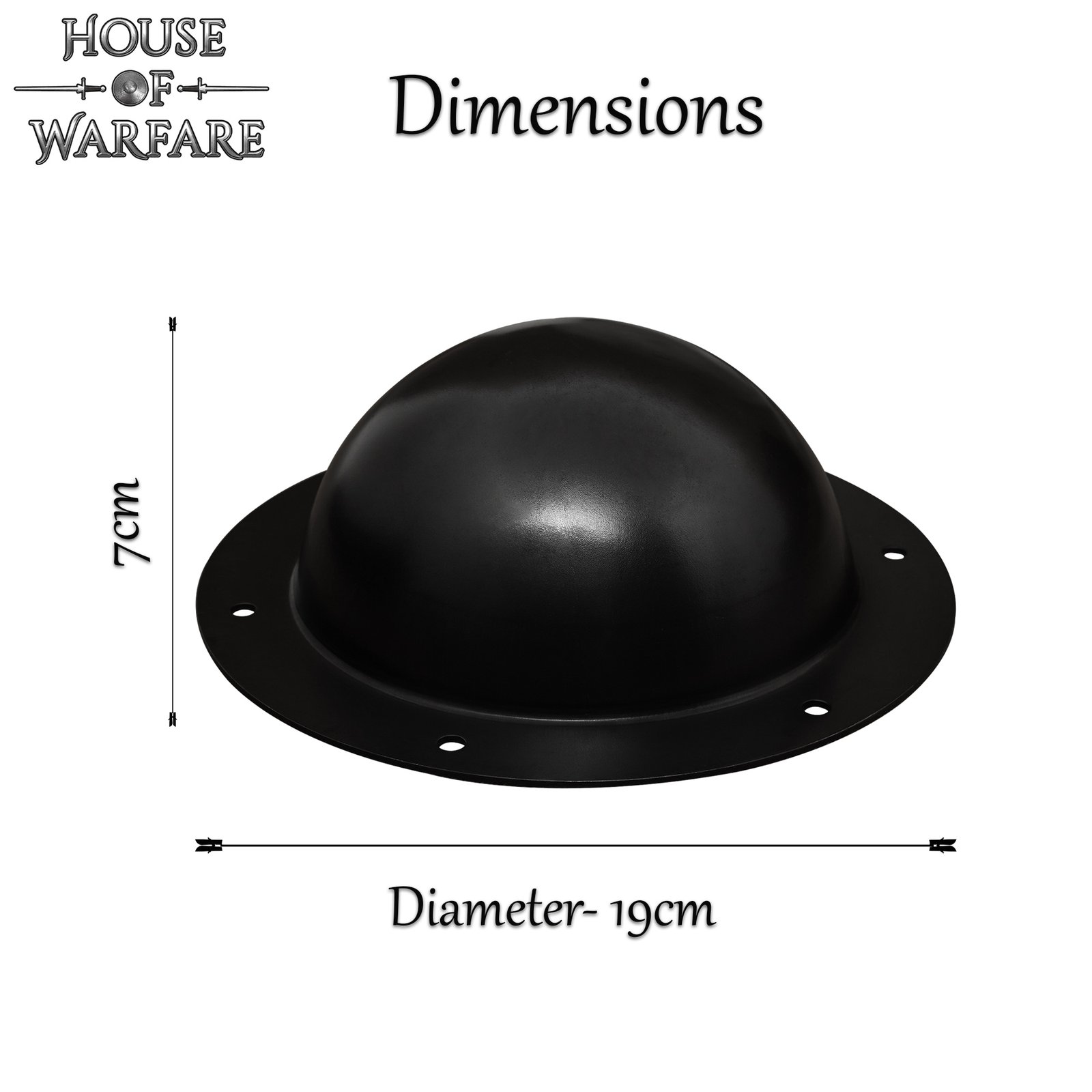 Crafted to suit almost all types of shields, be it from the middle ages or your favorite fantasy realm, this umbo boasts a rustic blackened finish that adds versatility to its usage. Its durable construction, made of 14 gauge mild steel, guarantees longevity and steadfastness, ensuring it withstands the rigors of repeated battles.
