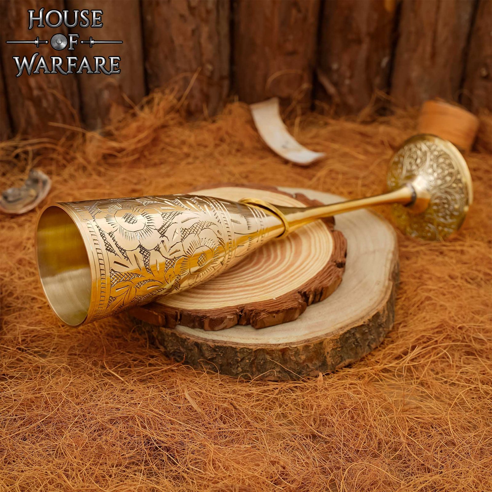 Hand-engraved floral and leaf patterns capture the artistry of medieval metalwork, while the polished brass surface glimmers in firelight—perfect for LARP tavern nights, immersive feast tables, or ritual displays. The wide base is both sturdy and decorative, ensuring your chalice sits proudly among swords, shields, and candles.